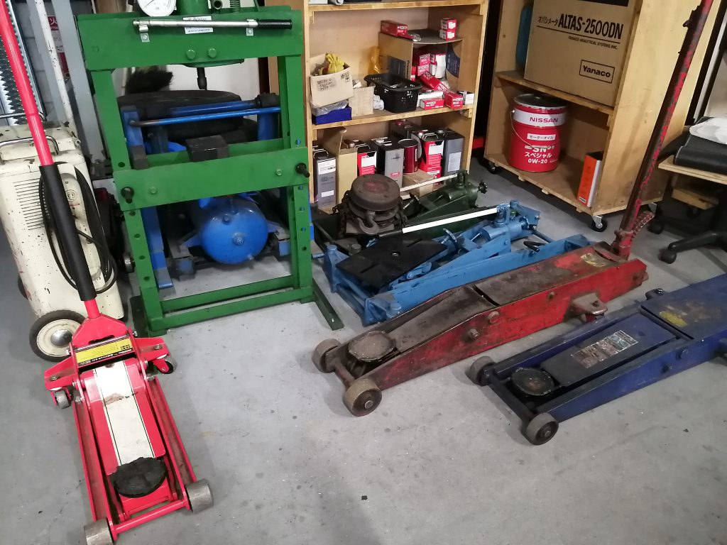 エンジンやミッションを持ち上げるジャッキや車体を持ち上げるためのジャッキです。